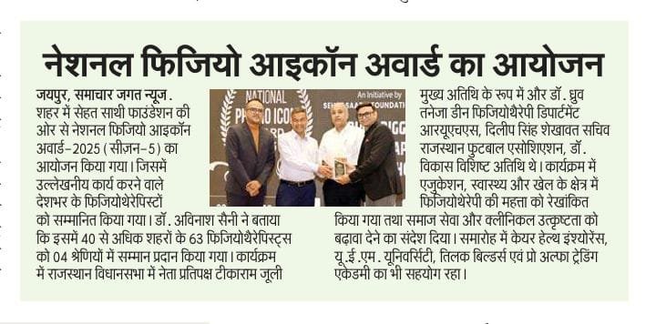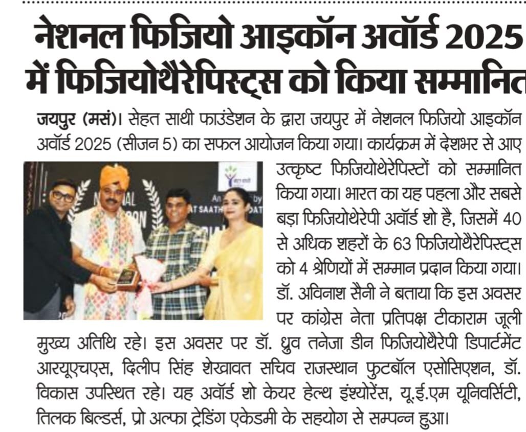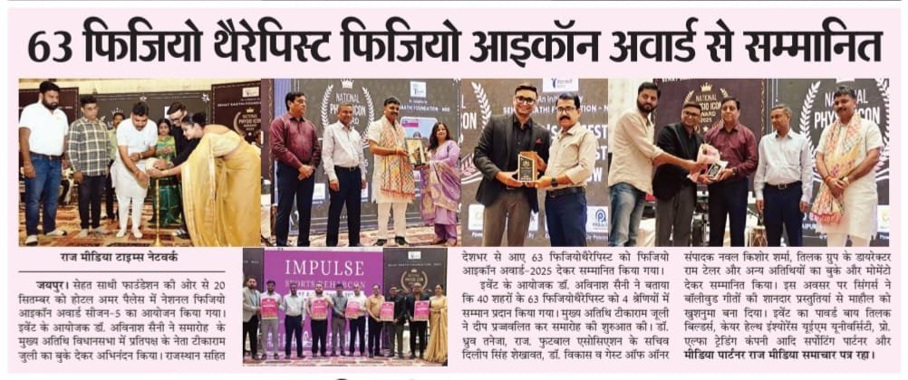 जयपुर। सेहत साथी फाउंडेशन की ओर से 20 सितम्बर को होटल अमर पैलेस में नेशनल फिजियो आइकॉन अवार्ड सीजन-5 का आयोजन किया गया। इवेंट के आयोजक डॉ. अविनाश सैनी ने समारोह के मुख्य अतिथि विधानसभा में प्रतिपक्ष के नेता टीकाराम जुली का बुके देकर अभिनंदन किया। राजस्थान सहित देशभर से आए 63 फिजियोथैरेपिस्ट को फिजियो आइकॉन अवार्ड-2025 देकर सम्मानित किया गया।